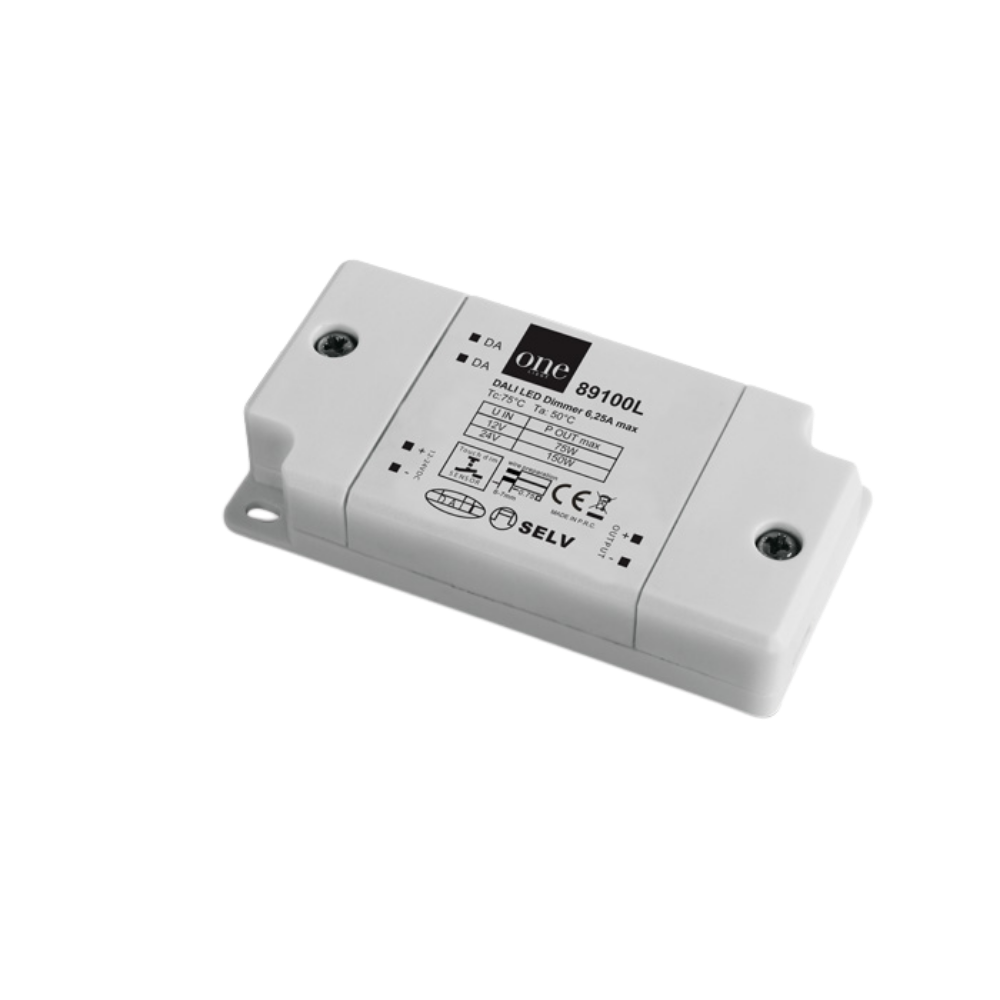 LED-Controller mit Konstantspannung 12-24 V DC, Leistung 75 W bei 12 V / 150 W bei 24 V, IP20, Kunststoffgehäuse 78 × 40 × 16 mm, dimmbar DALI und Push-to-DIM, für den Innenbereich.