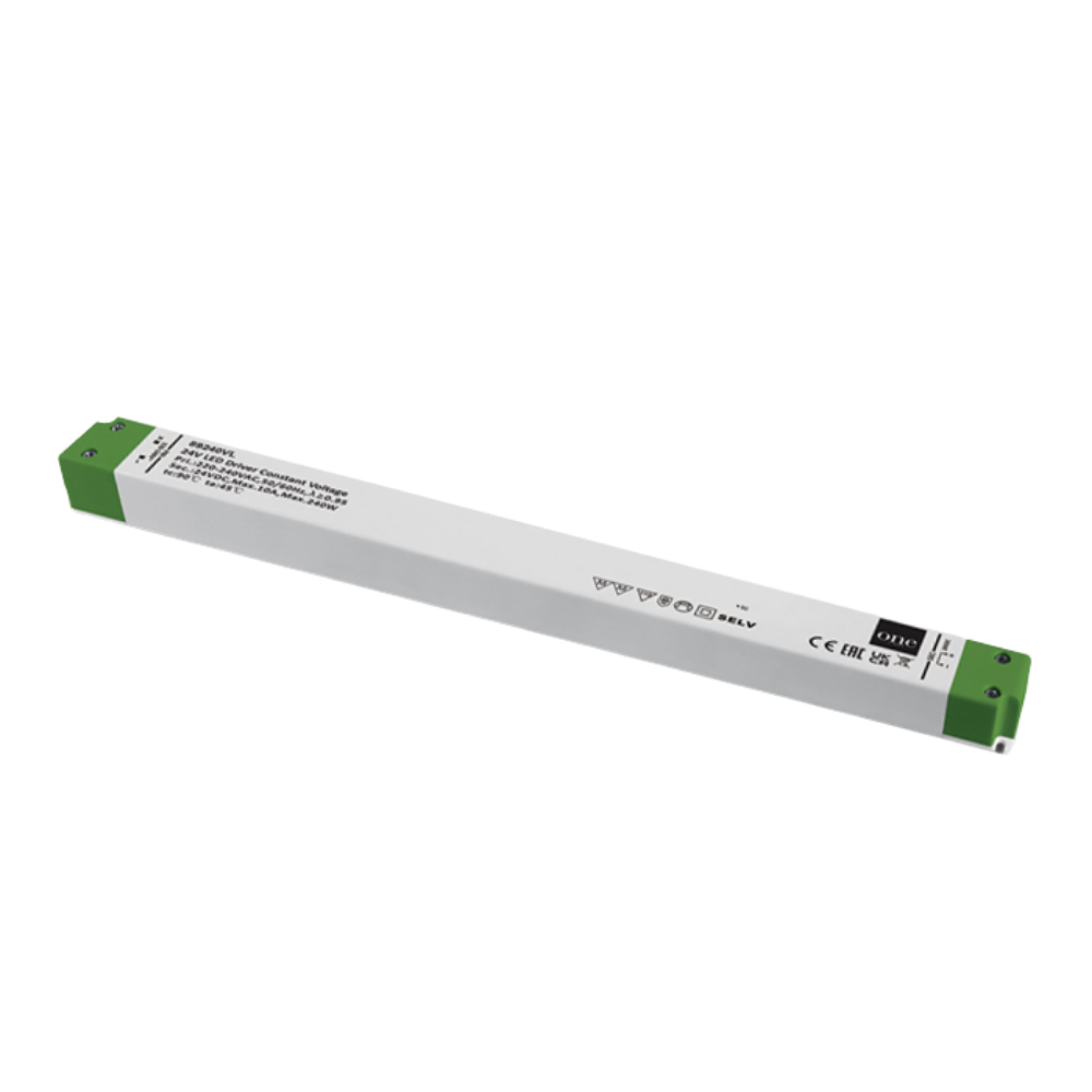 LED-Treiber mit Konstantspannung 24 V DC, Leistung 240 W, 220-240 V AC, Leistungsfaktor 0,95, IP20, schlankes Kunststoffgehäuse 320 × 30 × 18 mm, nicht dimmbar, für den Innenbereich, Schutz gegen Überlastung, Überhitzung und Kurzschluss
