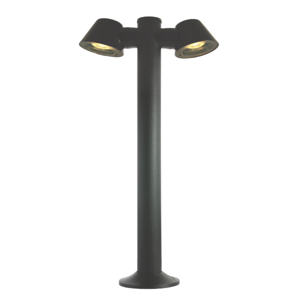 LED bollard for two GU10 lamps, max. wattage 2×6 W, ABS body + anthracite PC, height 750 mm, 100-240 V AC, non-dimmable, 1-direction swivel head, IP65 rating, supplied without bulbs.