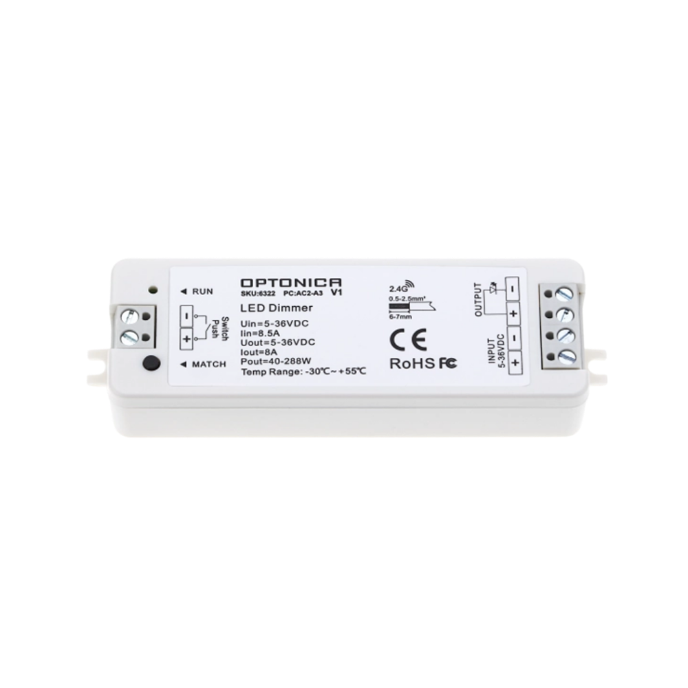 LED dimmer controller 5-36 V DC input/output, 1 channel 8.5 A (40-288 W), constant voltage, plastic housing 108 × 34 × 18 mm, remote control range up to 30 m, IP20.