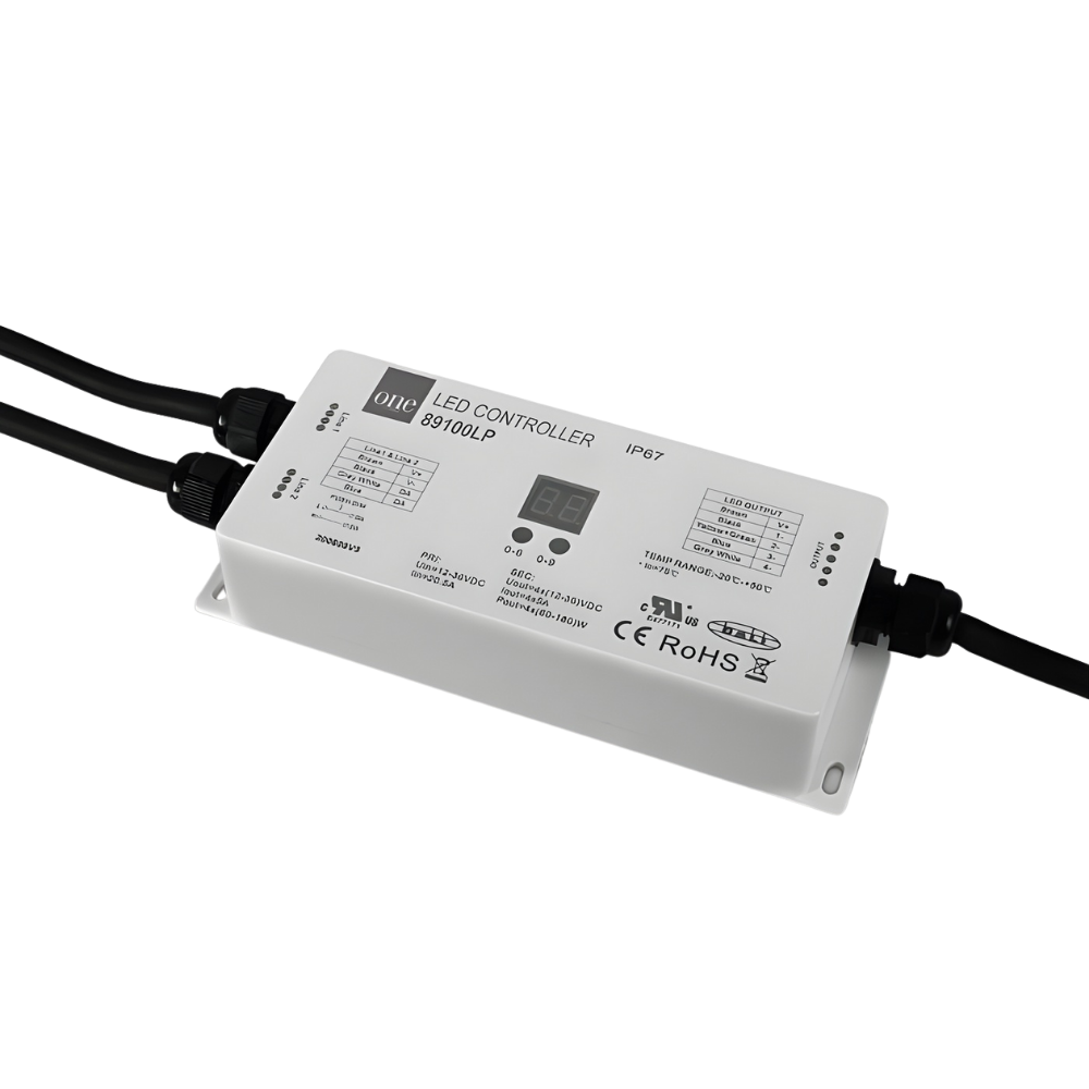 Variateur DALI / Push-to-Dim 4 canaux, tension constante 12–36 V, IP67. Compatible DALI 2.0 et Push-DIM, convient pour LED à tension constante. Boîtier compact étanche.