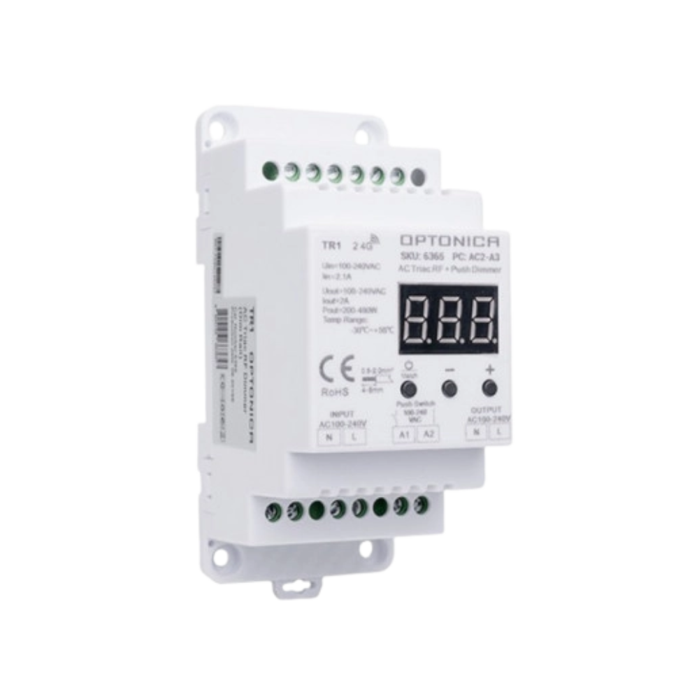 Variateur AC TRIAC 200–480 W, entrée/sortie 100–240 V AC, 1 canal 12 A, 100 niveaux de variation, boîtier plastique + aluminium blanc 110 × 64 × 45 mm, avec télécommande, IP20.