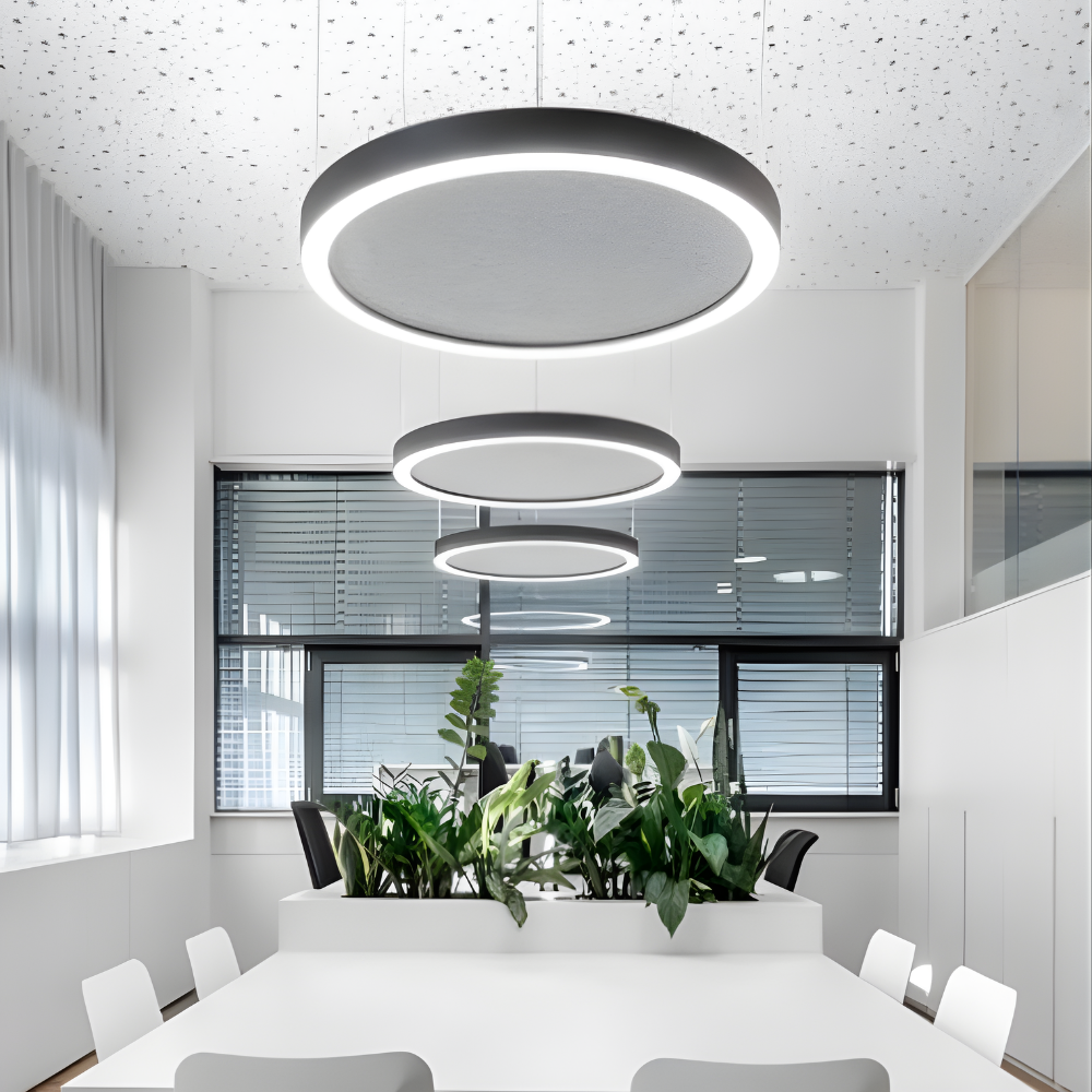 Suspension LED décorative acoustique, puissance 83–114 W, flux lumineux 5490–12000 lm, 3000 K, IRC 90. Structure en métal et acrylique avec panneau absorbant acoustique intégré en coton. Indice de protection IP20, 230 V AC, DALI.