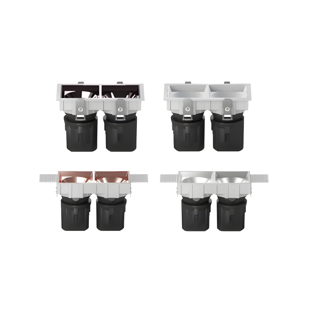Downlight LED encastré, dimensions L115×l65×H101 mm, découpe L105×l58 mm, 2 têtes (7–8 W chacune). Angles 15°/24°/36°/55° au choix. Puce CREE COB, driver Lifud (on/off). IP44