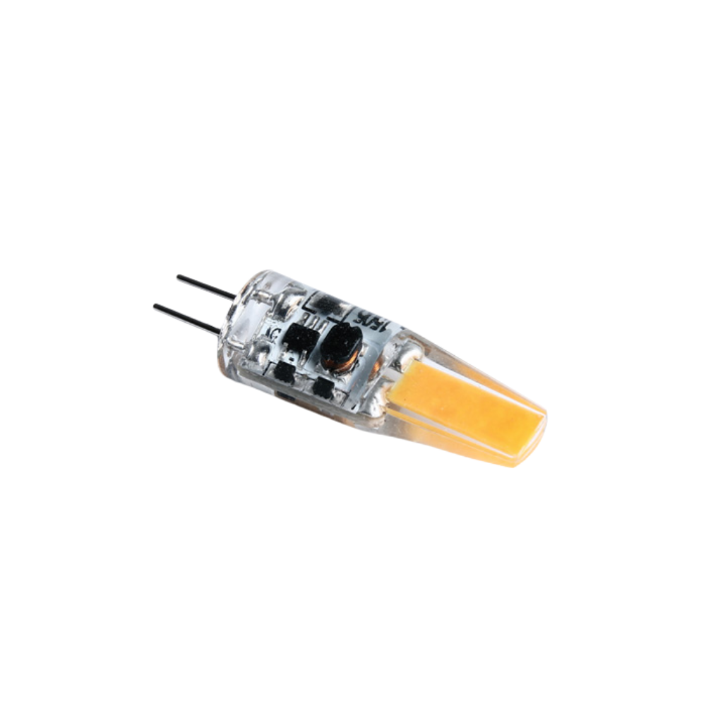 Capsule LED G4 2 W (12 V AC/DC), boîtier silicone. IRC ≥80. Température de couleur ~3000 K. Flux lumineux ~200 lm. Non Dimmable.