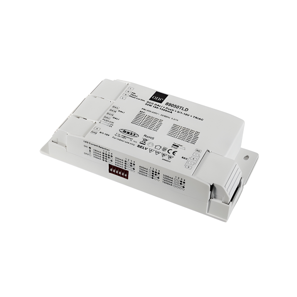 Driver LED à courant constant réglable 200–1500 mA (8–48 V DC), 220–240 V AC, facteur de puissance 0.95, dimmable DALI, 1–10 V, Push-DIM et TRIAC, boîtier plastique 165 × 83 × 35 mm, IP20, avec câble et connecteur rapide