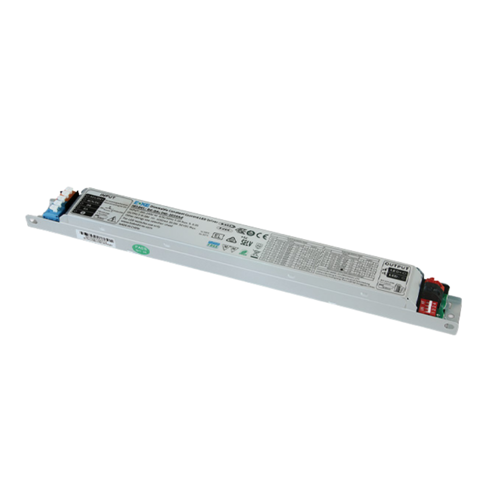 Driver LED à courant constant réglable, 6–42 V, sélection 400–1050 mA (DIP switch), AC220–240 V, FP 0.95, dimmable DALI & Push, IP20, corps plastique, 285 × 30 × 21 mm.