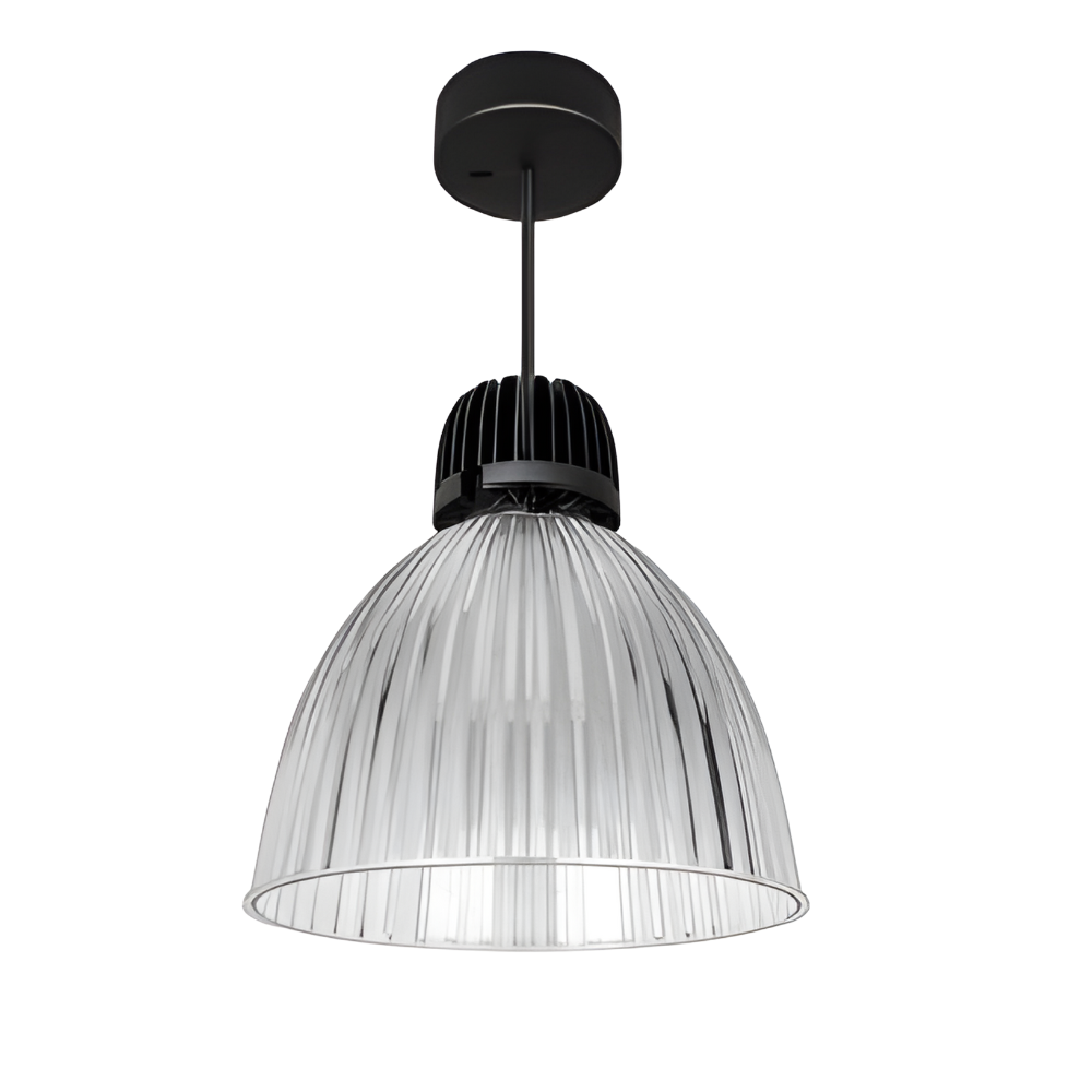 Suspension LED Ø400 × H250 mm, 42 W, 3000 K, IRC 90, 3500 lm, Dissipateur thermique en aluminium moulé sous pression, abat-jour en polycarbonate transparent. Équipée d’une LED Philips COB et d’un driver Eaglerise. Angle de faisceau : 18° / 24° / 36°. Fourni avec câble d’alimentation et filin acier de 2 m.