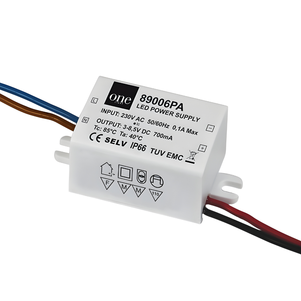 Driver LED à courant constant 700 mA, 3–8.5 V DC, 1.5–6 W, 220–240 V AC, facteur de puissance 0.5, non dimmable, boîtier plastique 55 × 30 × 24 mm, IP66, avec câble et connecteur rapide.