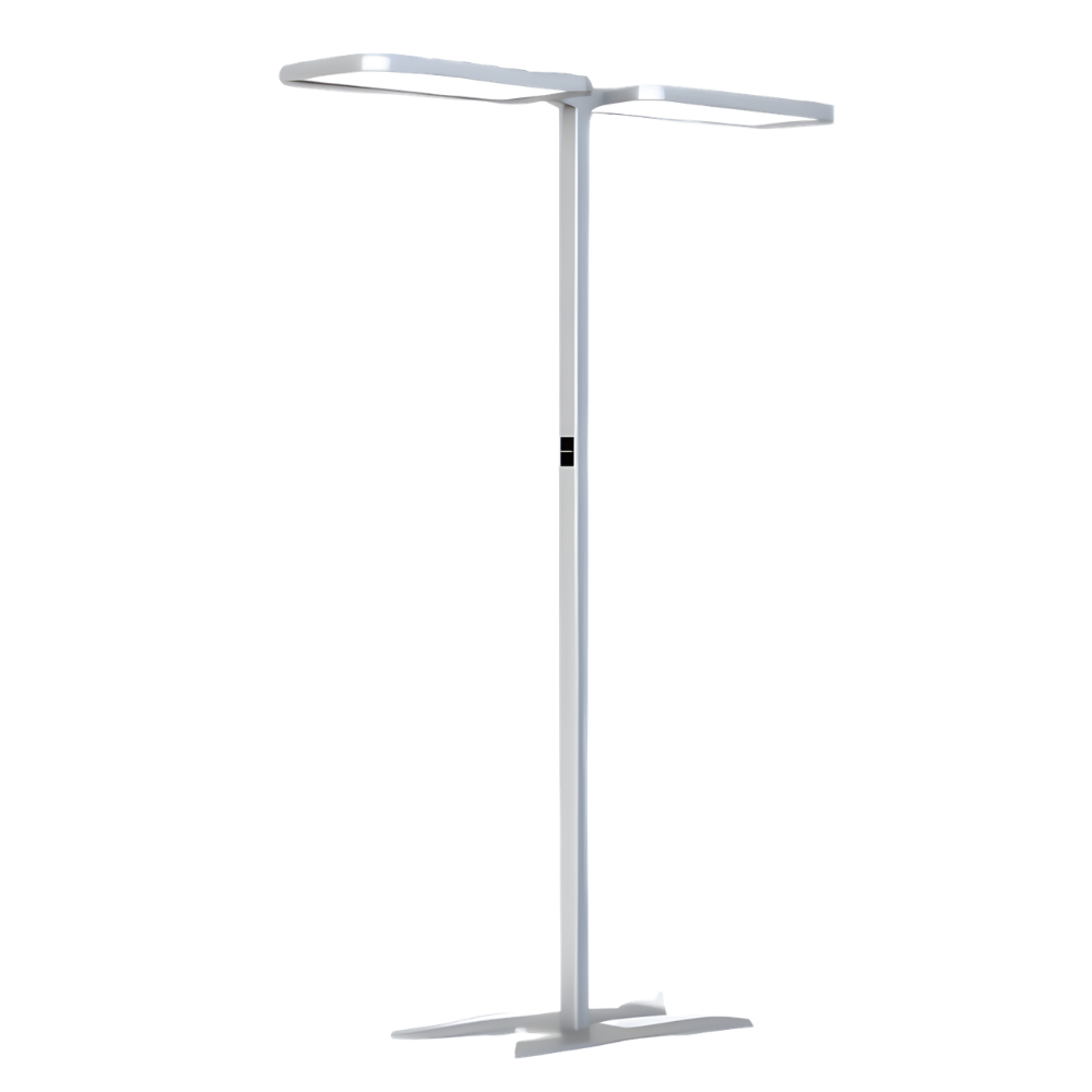 Lampadaire LED, 1342×310×1950 mm, 2×80 W (uplight + downlight), Philips SMD2835, blanc variable 3000–6000 K dimmable, IRC 80, >100 lm/W, AC200–240 V, PF >0.9, sans scintillement, IP20, détecteur mouvement + lumière avec arrêt automatique à 800 lux, boîtier blanc.