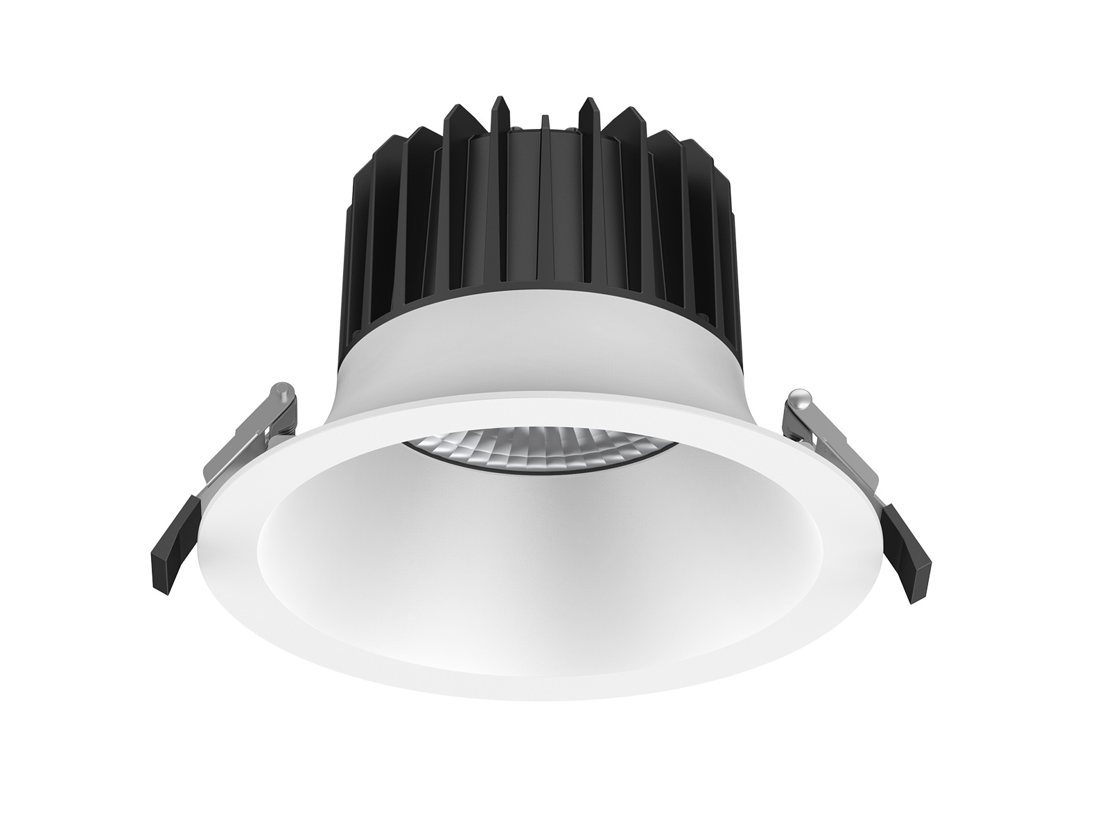 Downlight LED encastré Ø110×H75 mm, découpe Ø90–100 mm, 10 W, 3000 K, angle 36°, 870–1040 lm, IRC 90. Source COB Bridgelux, alimentation 220–240 V AC, driver VSI sans scintillement. Protection IP44 à l’avant, non dimmable.