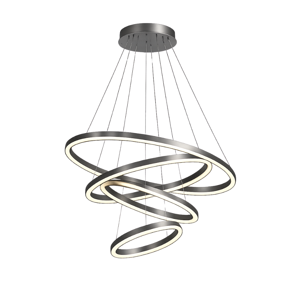 Suspension Led décorative. Puissance 100 W, température de couleur 3000 K, IRC 80. Tension AC 200–240 V, 50/60 Hz. Driver DALI, sans scintillement. Indice de protection IP40. Hauteur 200 mm, diamètres combinés : D30 + D40 + D60 + D80 mm.