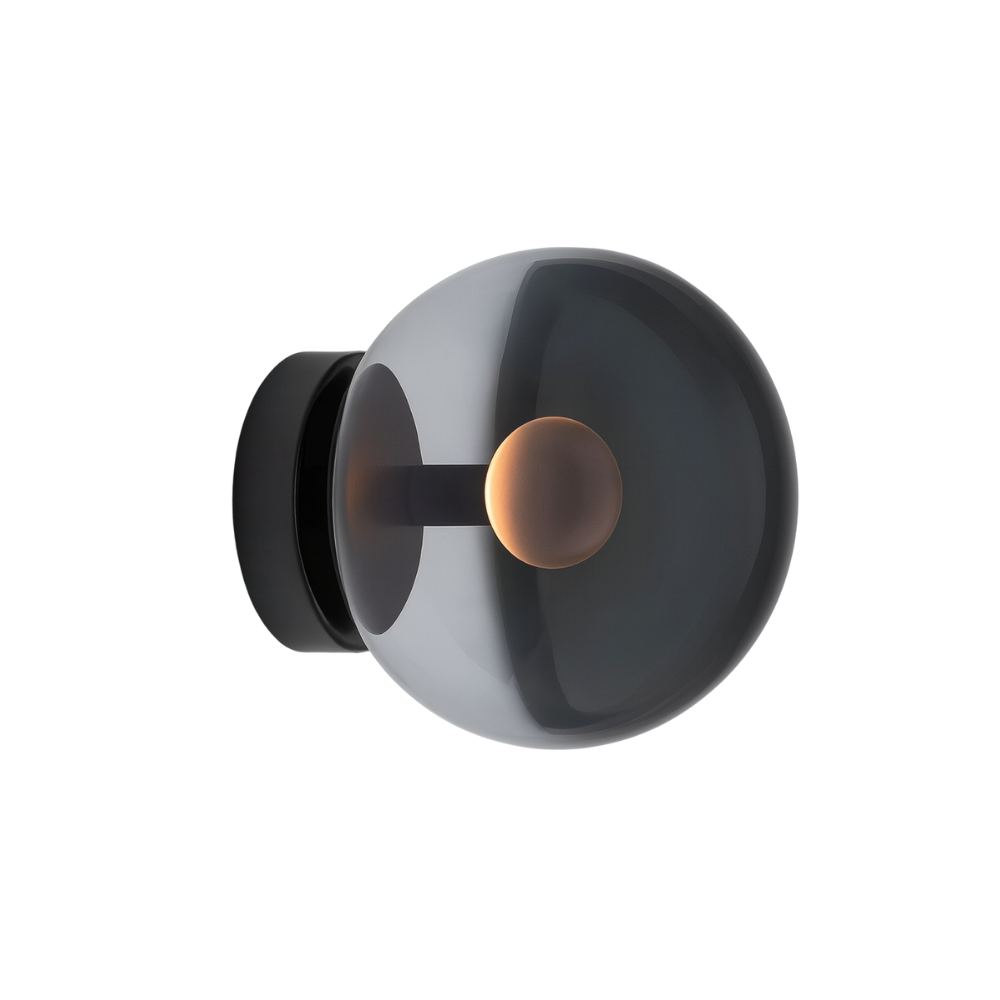 Applique murale LED décorative, dimensions 125 × 133 mm, base Ø88 mm. Finition : chrome foncé + verre fumé. Puissance 9 W, 3000 K, flux lumineux 200 lm.