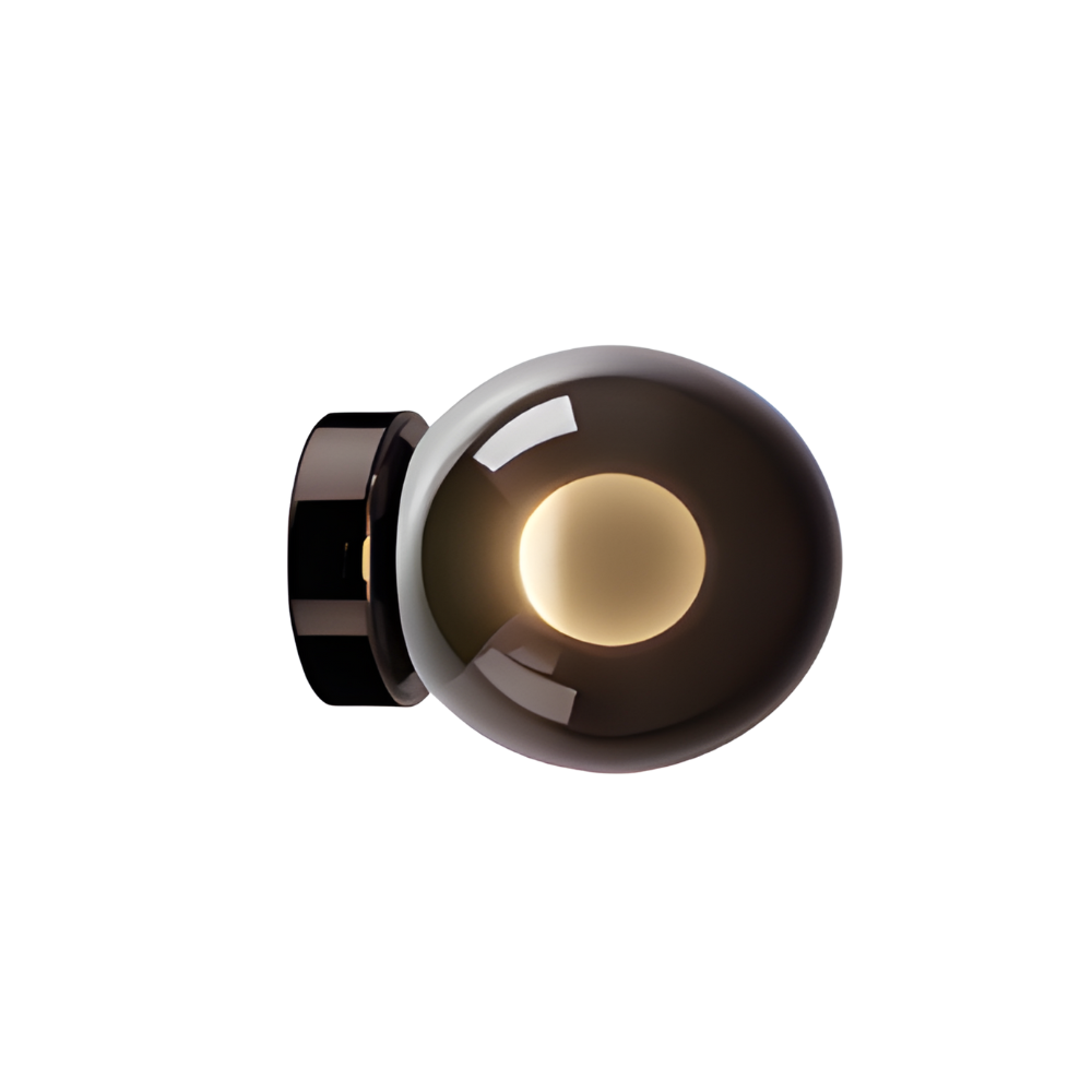 Applique murale LED décorative, dimensions 125 × 133 mm, base Ø88 mm. Corps en acier inoxydable 201 avec abat-jour en verre fumé. Finition : chrome foncé + verre fumé. Puissance 5 W, 3000 K, flux lumineux 350 lm.
