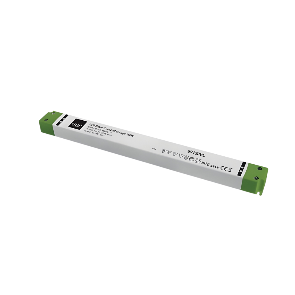 Driver LED à tension constante 24 V DC, puissance 150 W, 220–240 V AC, facteur de puissance 0,9, IP20, boîtier plastique slim 320 × 30 × 19 mm, non dimmable, conçu pour installation dans les profils, protection contre surcharge, surchauffe et court-circuit