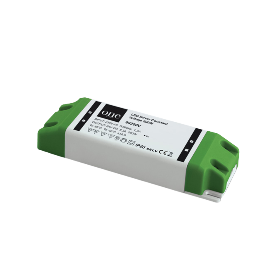 Driver LED à tension constante 24 V DC, puissance 200 W, 220–240 V AC, facteur de puissance 0,9, IP20, boîtier plastique 205 × 71 × 35 mm, non dimmable, usage intérieur, protection contre surcharge, surchauffe et court-circuit