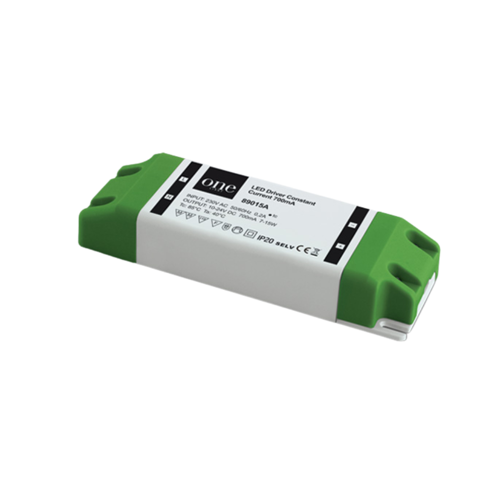 Driver LED à courant constant 700 mA, 10–21.4 V DC, 7–15 W, 220–240 V AC, non dimmable, boîtier plastique 120 × 42 × 20 mm, IP20, câble 15 cm, avec connecteur rapide.