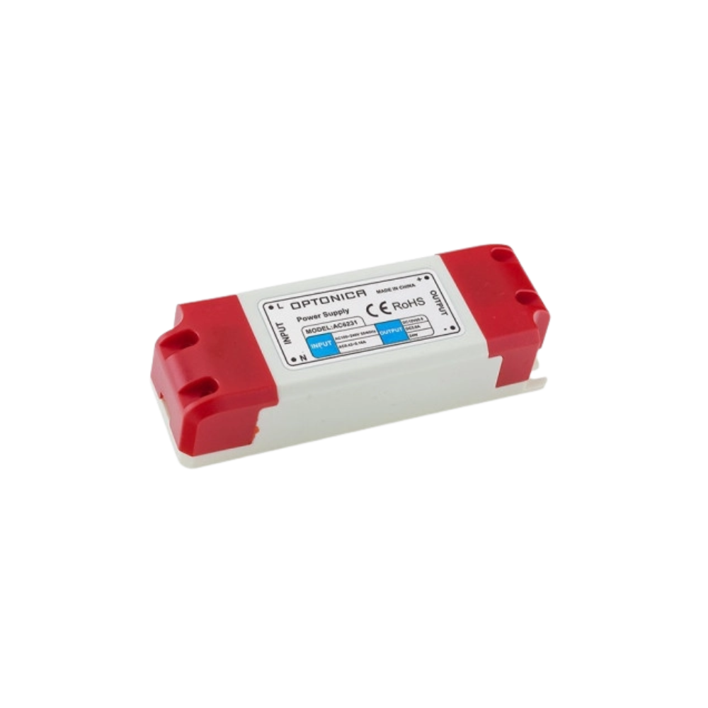 Alimentation LED 24 W, 12 V DC, sortie 2 A, boîtier plastique 120 × 42 × 28 mm, entrée AC 100–240 V, facteur de puissance 0.5, 50–60 Hz, IP20.