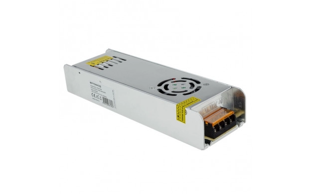 Alimentation métallique pour bande LED, 250 W, 24 V DC, sortie 10 A, boîtier aluminium 228 × 71 × 43 mm, entrée AC 220 V, facteur de puissance 0.5, avec ventilateur intégré, 50–60 Hz, IP20.