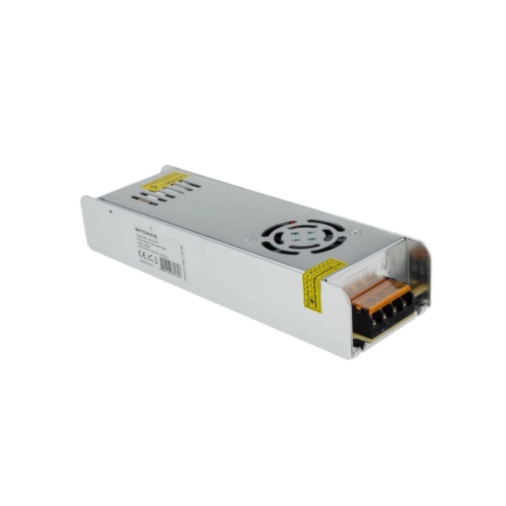 Alimentation métallique mince pour bande LED, 360 W, 24 V DC, sortie 15 A, boîtier aluminium 228 × 71 × 43 mm, entrée AC 220 V, facteur de puissance 0.5, avec ventilateur intégré, 50–60 Hz, température de fonctionnement -20°C à +40°C, durée de vie 25’000 h, IP20.