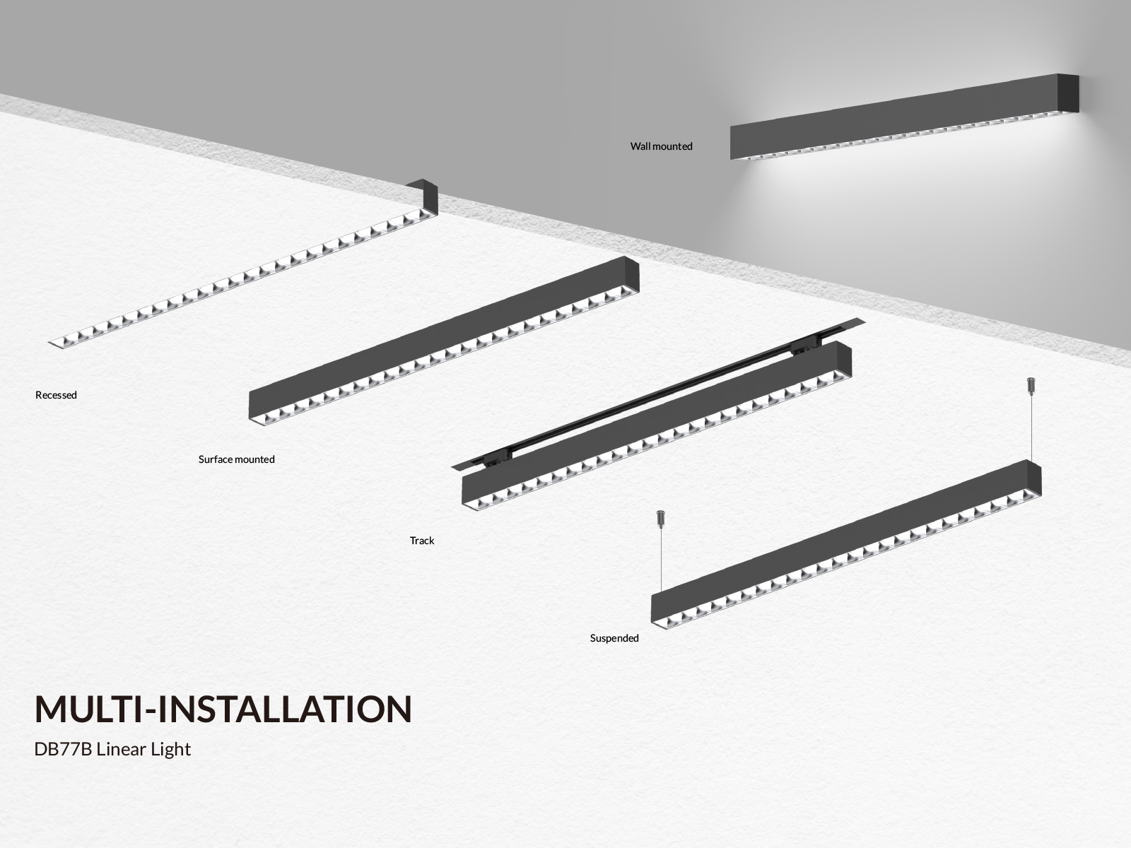 Installation possible en surface, suspendue, murale, encastrée ou sur rail.