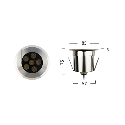 Spot LED encastré IP67, découpe Ø65–70 mm, 5–6 W, 450 lm, 3000K, CRI ≥80, corps inox SU304, verre trempé haute température, alimentation DC24V, fonctionnement jusqu’à 80 °C.