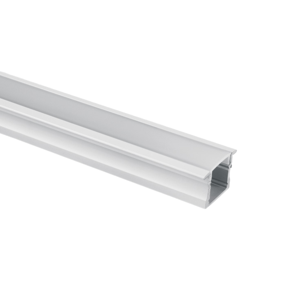 Profilé aluminium encastré pour bande LED, longueur 2000 mm, largeur 23 mm, hauteur 9 mm, finition blanche, diffuseur PC, découpe 18 mm × 2000 mm, profondeur 16 mm.