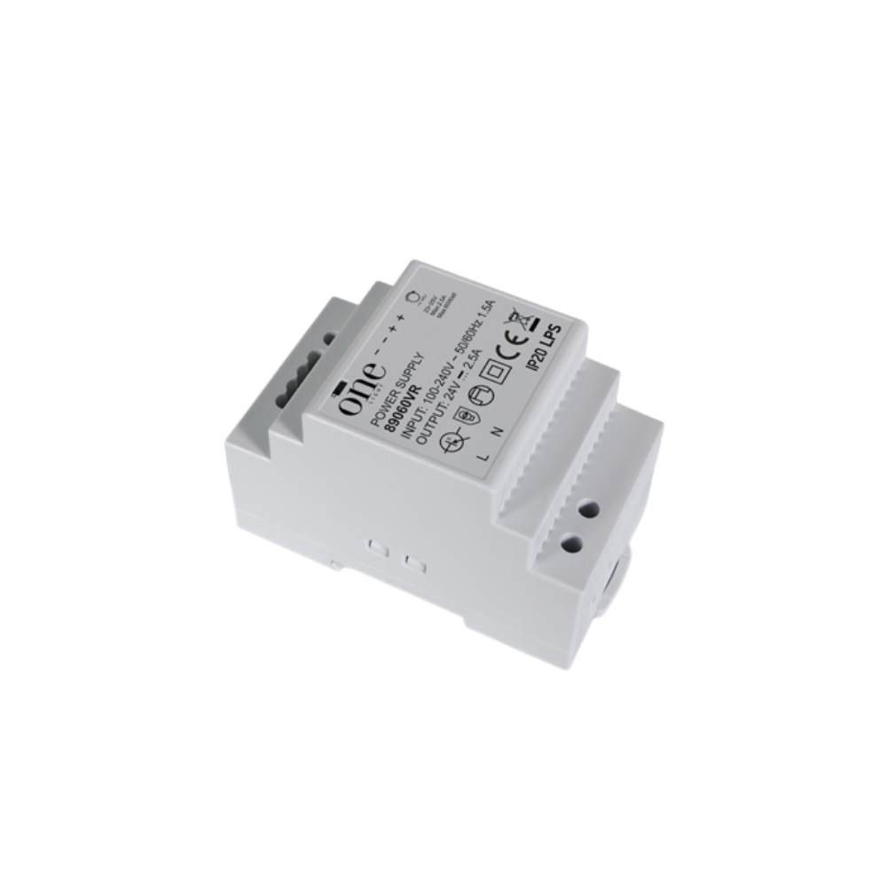 Driver LED à tension constante 24 V DC, puissance 60 W, 100–240 V AC, facteur de puissance 0,95, IP20, boîtier plastique 51 × 92 × 58 mm, montage sur rail DIN, non dimmable, protection contre surcharge, surchauffe et court-circuit.