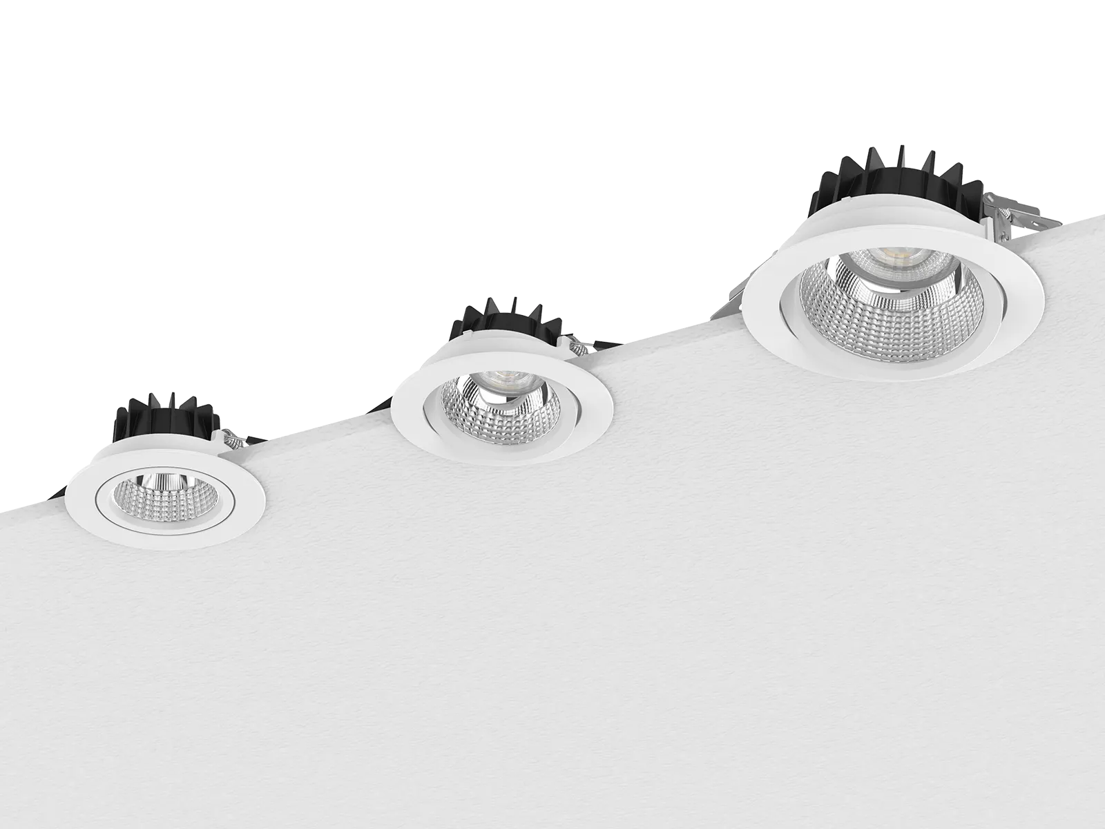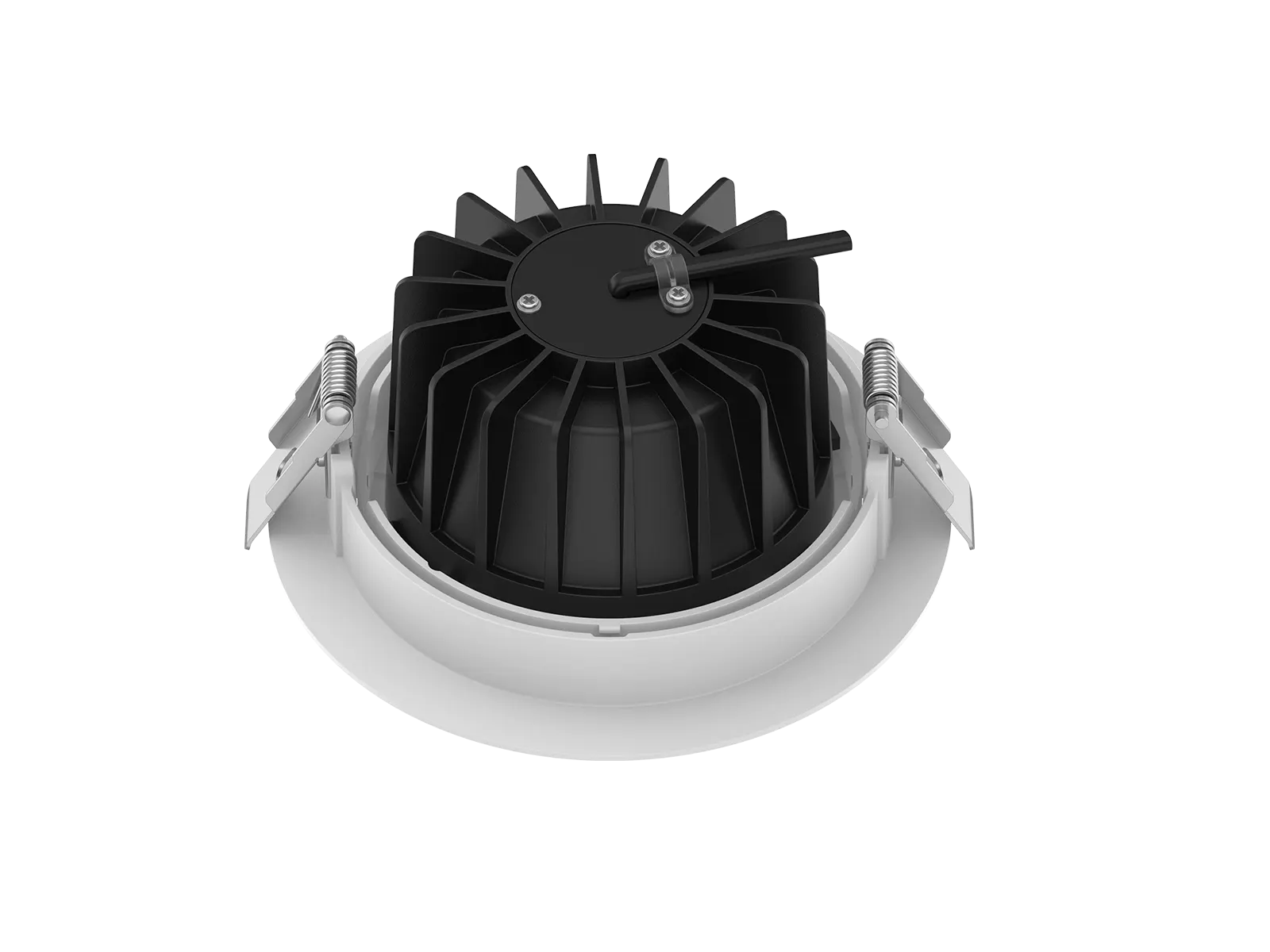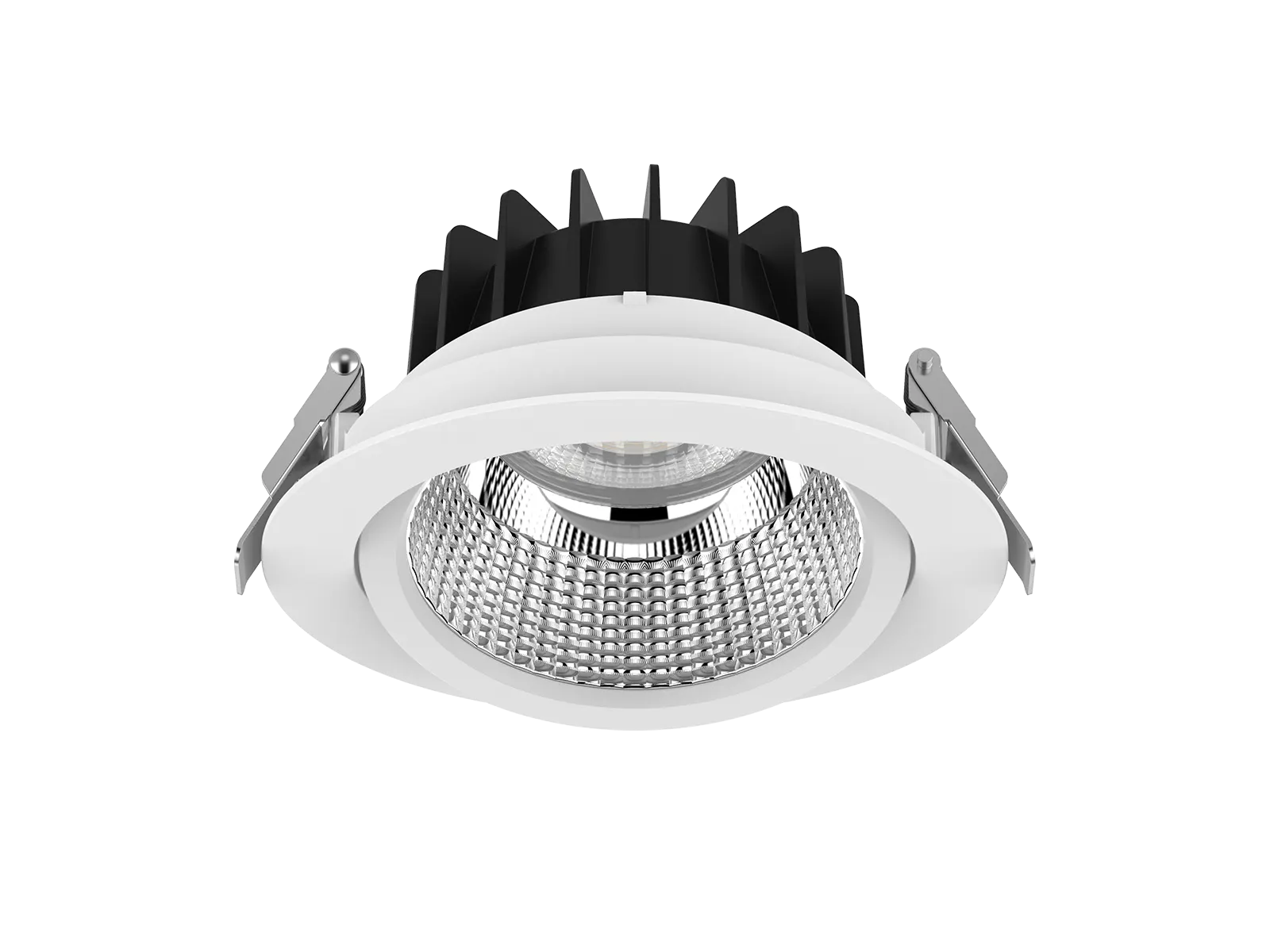 Downlight LED encastré Ø160×78 mm, découpe Ø140–150 mm, 25 W, 2700–5000 K au choix, 1400–2430 lm, IRC 80. Source COB Bridgelux, alimentation 220–240 V AC sans scintillement. Angle de faisceau : 24° / 36° (UGR<19) et 60° (UGR<22). Corps en aluminium, IP20.
