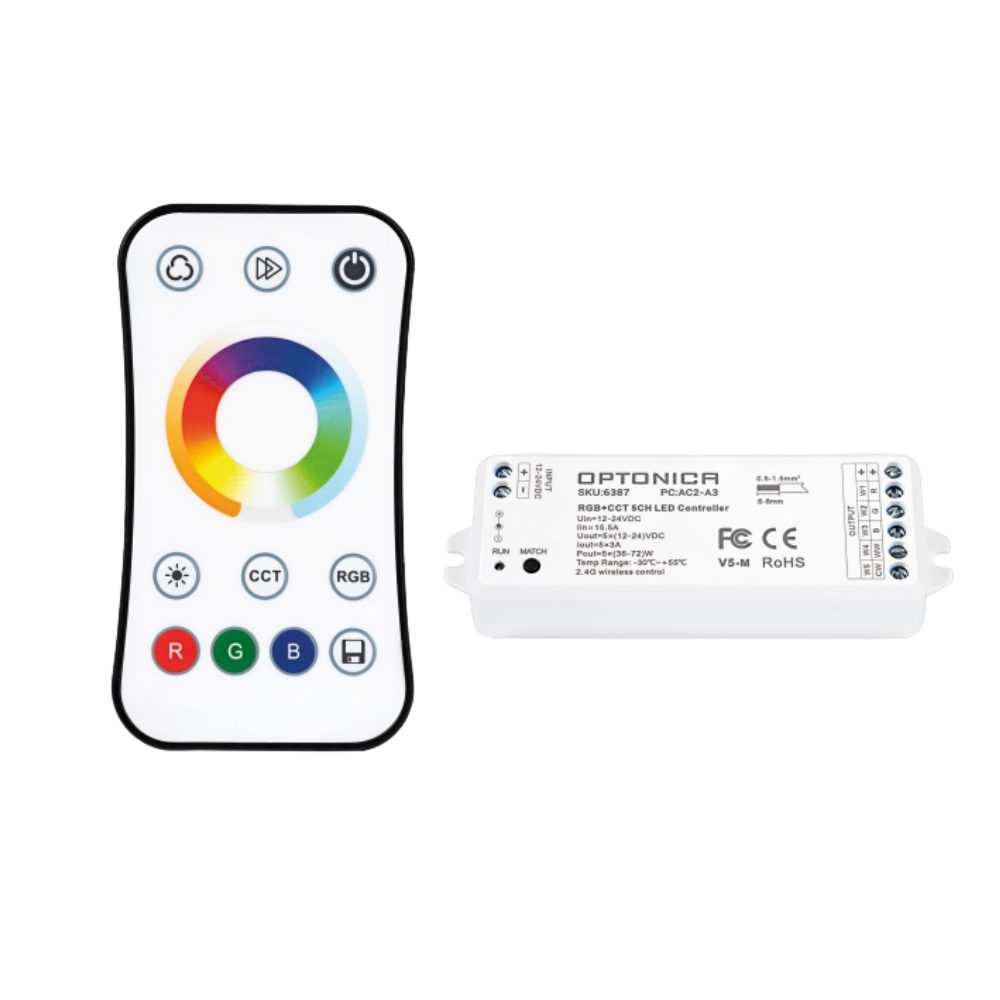 Kit télécommande RF 2.4 GHz pour éclairage LED RGB + CCT, 1 zone, alimenté par pile 3 V DC (CR2032), portée jusqu’à 30 m, courant de fonctionnement <5 mA, courant de veille <10 µA, autonomie en veille jusqu’à 1 an, IP20.