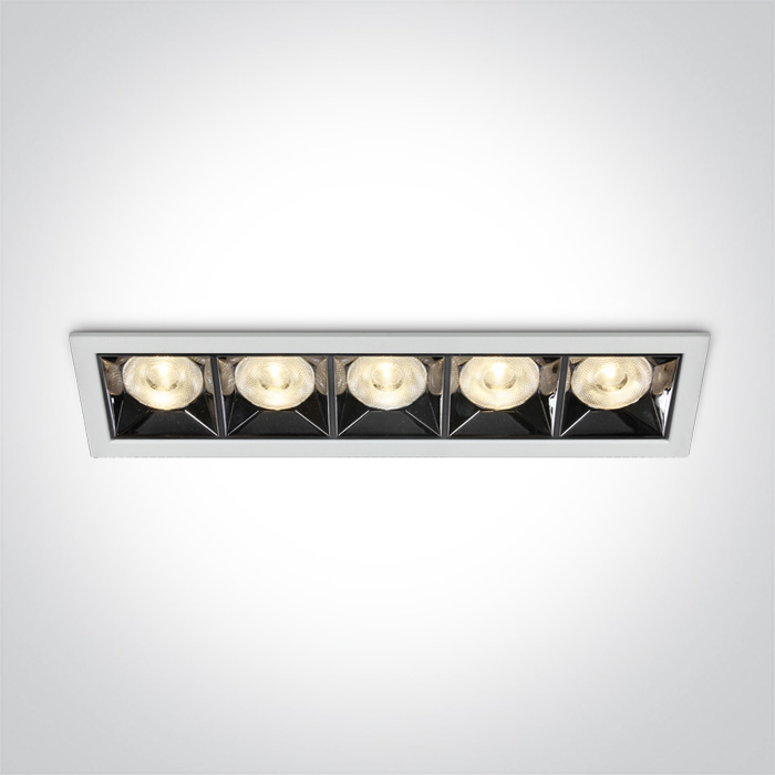 Spot encastré LED 20 W, 3000 K, 1600 lm, 80 lm/W, angle 38°. Alimentation 220–240 V AC, driver externe 500 mA inclus, IP20, IRC 90. Corps en aluminium moulé blanc avec réflecteur chrome foncé. Dimensions : 207 × 54 × 47 mm, découpe 200 × 45 mm, profondeur d’encastrement 70 mm.