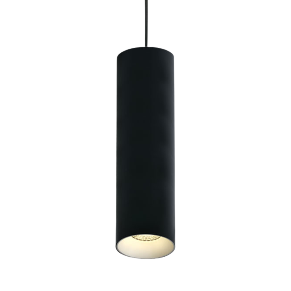 Suspension cylindrique Ø75 × 400 mm, douille GU10, 10 W max, 100–240 V. Design Dark Light avec réflecteur interchangeable (à commander séparément). Corps aluminium, IP20. Noir.