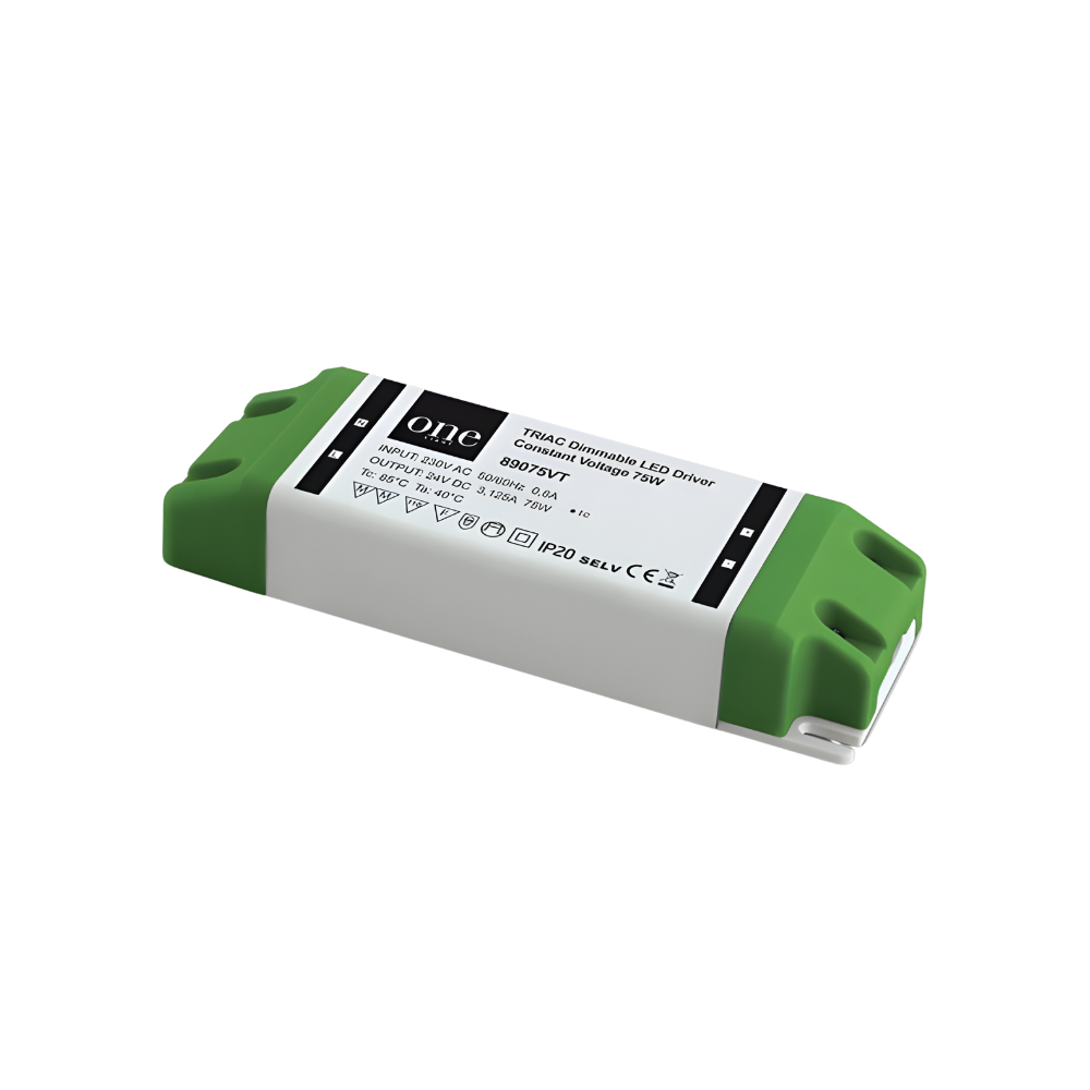 Driver LED à tension constante 24 V DC, puissance 10–75 W, 220–240 V AC, facteur de puissance 0,95, IP20, boîtier plastique 171 × 57 × 31 mm, dimmable TRIAC, usage intérieur.