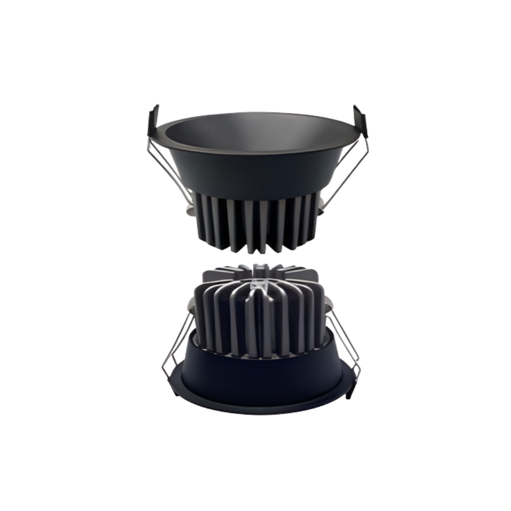 Spot LED encastré, puissance 8.4 W, température de couleur 3000 K, angle de faisceau 24°, efficacité lumineuse de 107 lm/W. Dimensions Ø85×79 mm, découpe Ø75 mm. LED CREE ou Toyonia, IRC 80/90, alimentation AC200–240 V, 50/60 Hz. Driver DALI 2.0, IP40, facteur de puissance >0.9, sans scintillement. Finition noire.