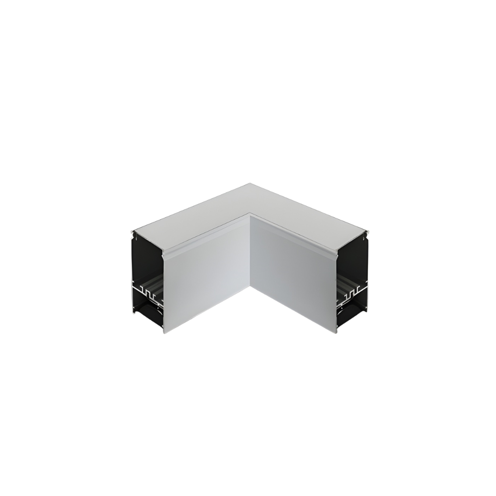 Accessoire linéaire LED en aluminium, finition blanche, 100 × 70 × 35 mm, compatible avec installation au plafond ou suspendue, IP20, usage intérieur.